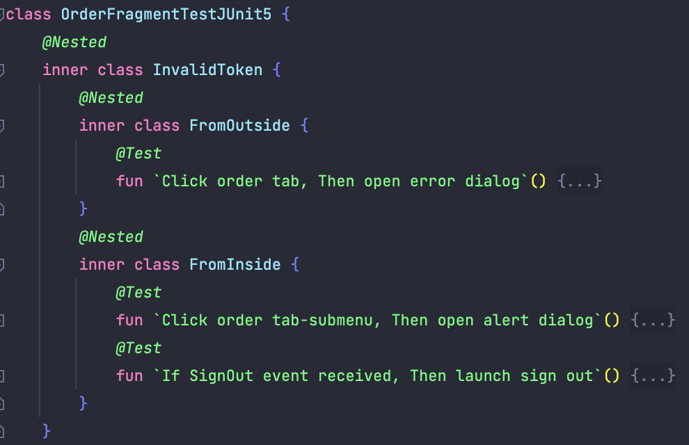 위에서 일부러 설명을 안했는데, @Nested 가 지원됨과 함께 각 테스트케이스들은 클래스 단위로 격리되므로 범위가 다르다면 메소드 명도 같은 것을 쓸 수 있어 보다 네이밍에 대한 걱정이 줄어듭니다 ㅎㅎ